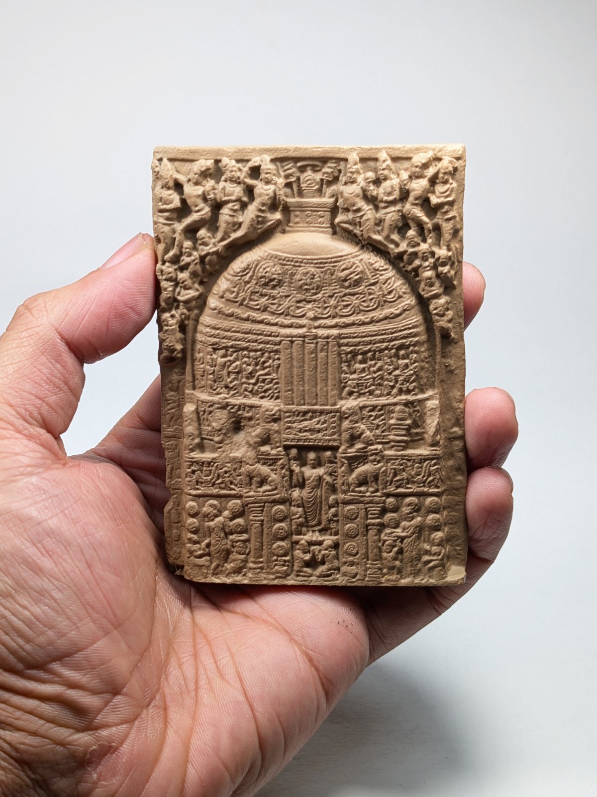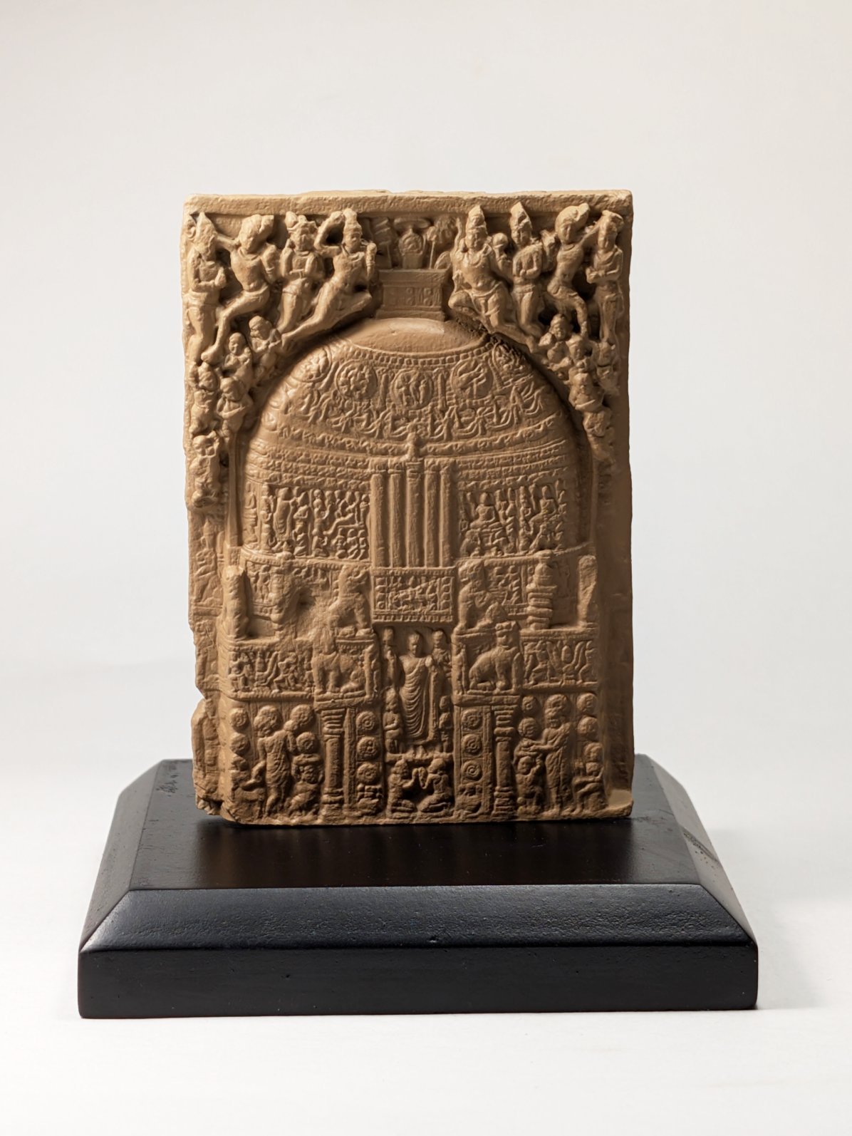 Front: Around AD 250, during a major renovation, the relief was turned over and the stone reused. Recycling materials ensured the gifts of former donors continued to benefit the development of the site. The later side was carved with an image of the Great Shrine itself, revealing what it may have looked like. It shows the dome covered in Buddhist symbols and stories, while the Buddha himself stands in bodily form at the gateway, flanked by devotees.