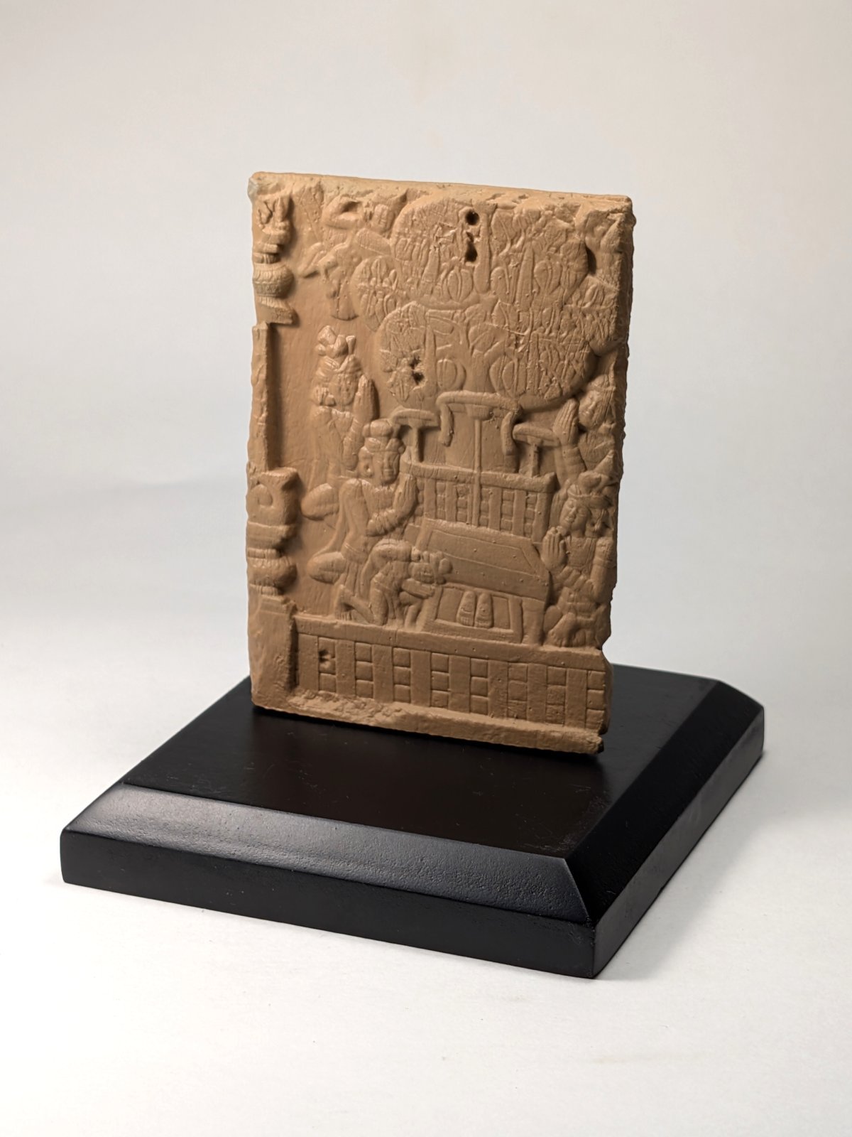 Back: Carved around 50 BC, shows devotees gathering around an empty throne with their hands clasped in gestures of reverence, while heavenly figures hover above.