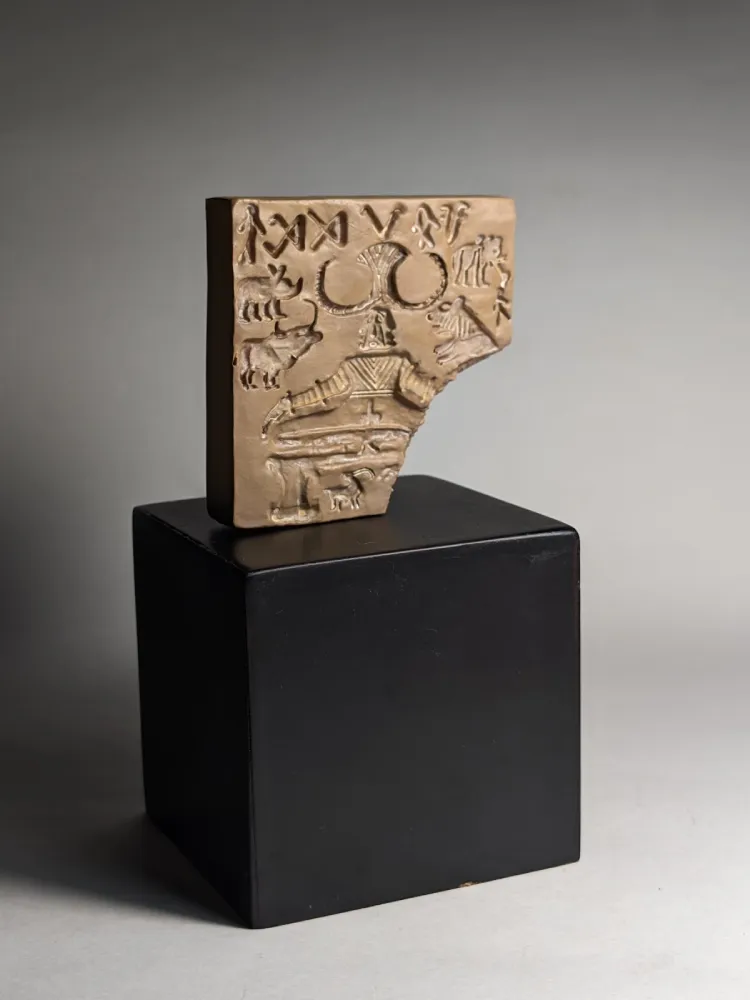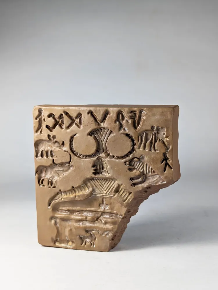 The Pashupati Seal from Mohenjo-Daro depicts a horned deity seated in a yogic posture, surrounded by wild animals. Believed to represent Lord Shiva as Pashupati, “Lord of Animals,” the figure symbolizes control over nature, fertility, and early ascetic traditions of the Indus Valley Civilization.